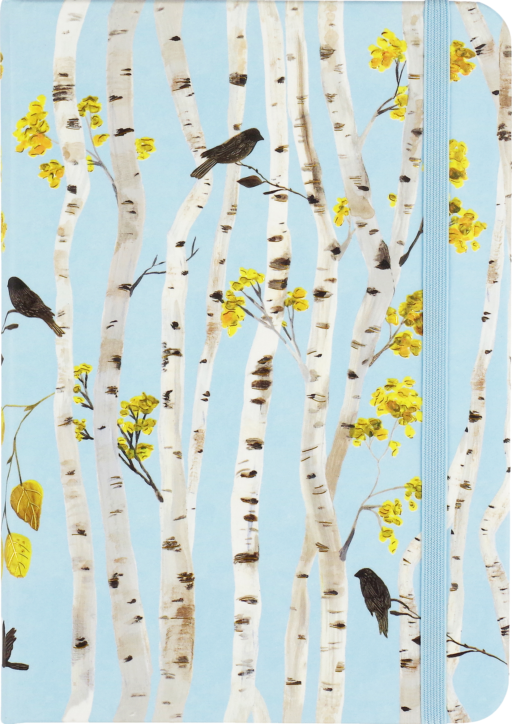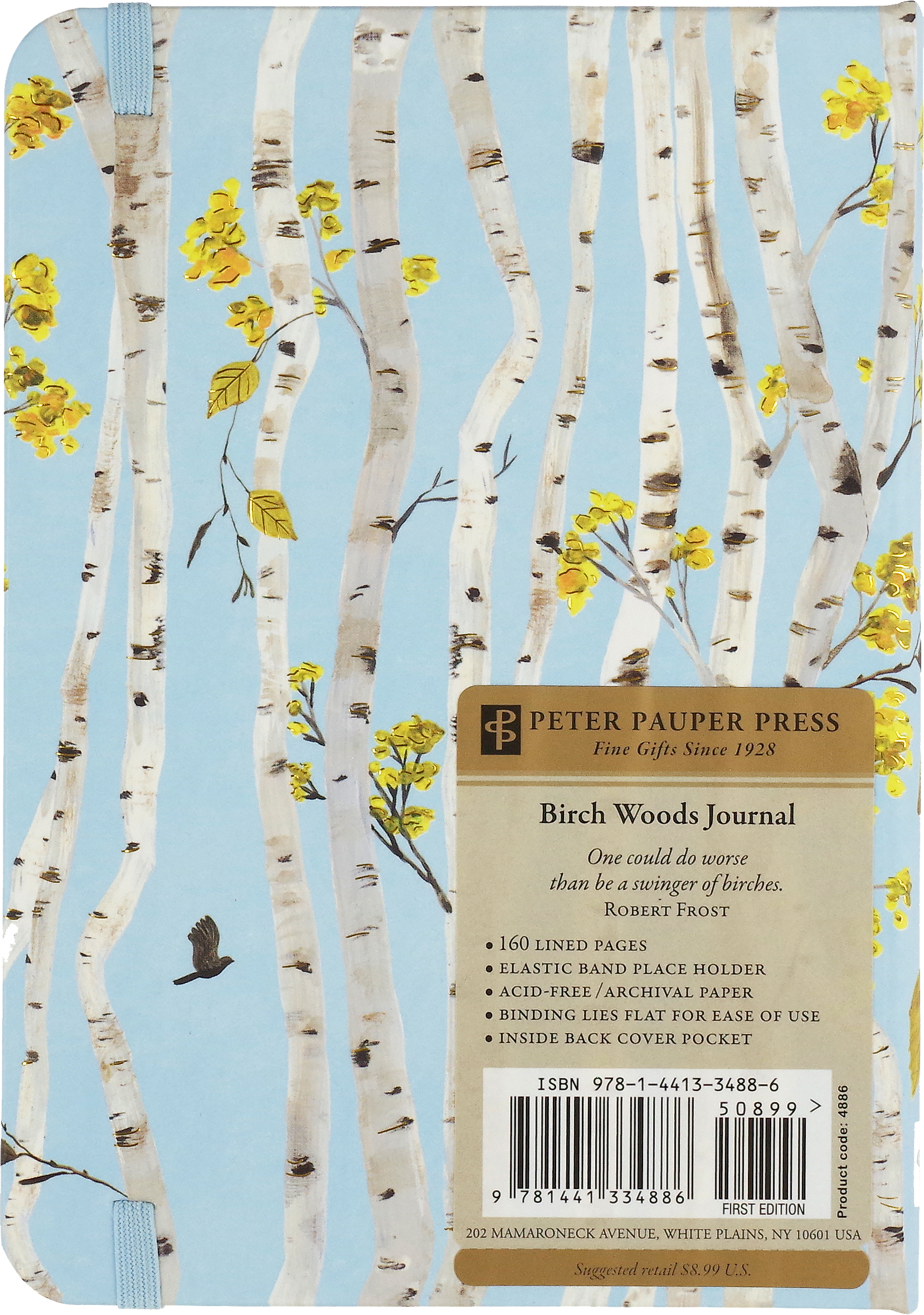 Lovely journal design depicts a birch forest enlivened with black birds. 160 crisp writing pages provide plenty of space for personal reflection, sketching, or jotting down favorite quotations or poems. Smooth-finish 120 gsm paper takes pen or pencil beautifully. Light gray lines subtly guide your writing. Paper is acid-free and of archival quality . Tuck notes, mementos, and more within the pocket inside the back cover. The matching elastic closure keeps it all together. Design is embossed and embellished with gold foil. Complementary interior endsheets enhance the design. Durable hardcover binding. Popular small-format size -- 5'' wide x 7'' high -- fits easily in most bags and backpacks.