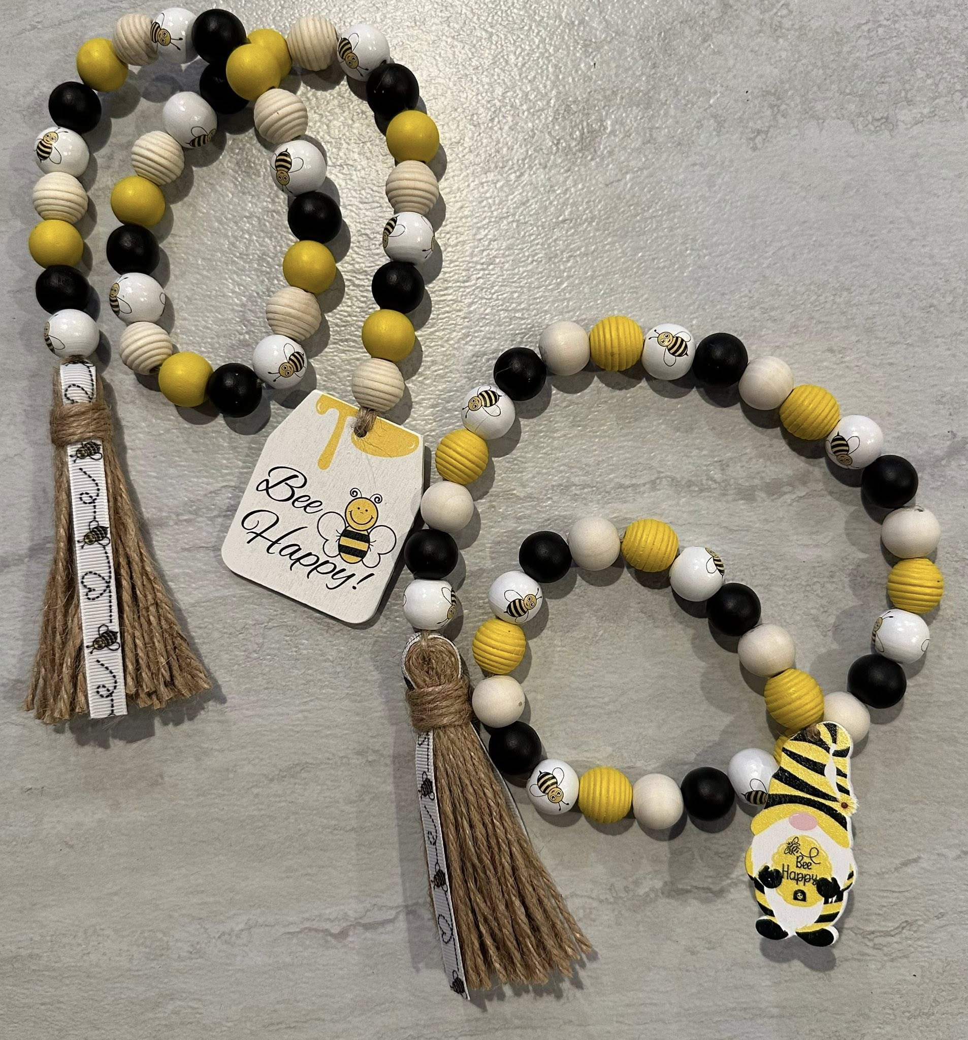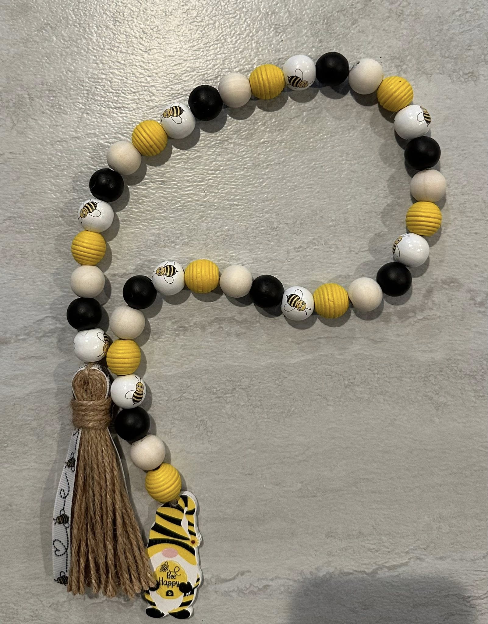 Bead garland is made with jute, painted white bee and natural wood beads, bumble bee gnome wood ornament, and white bee ribbon. There are painted hive beads as well. Not made by Stacey.
