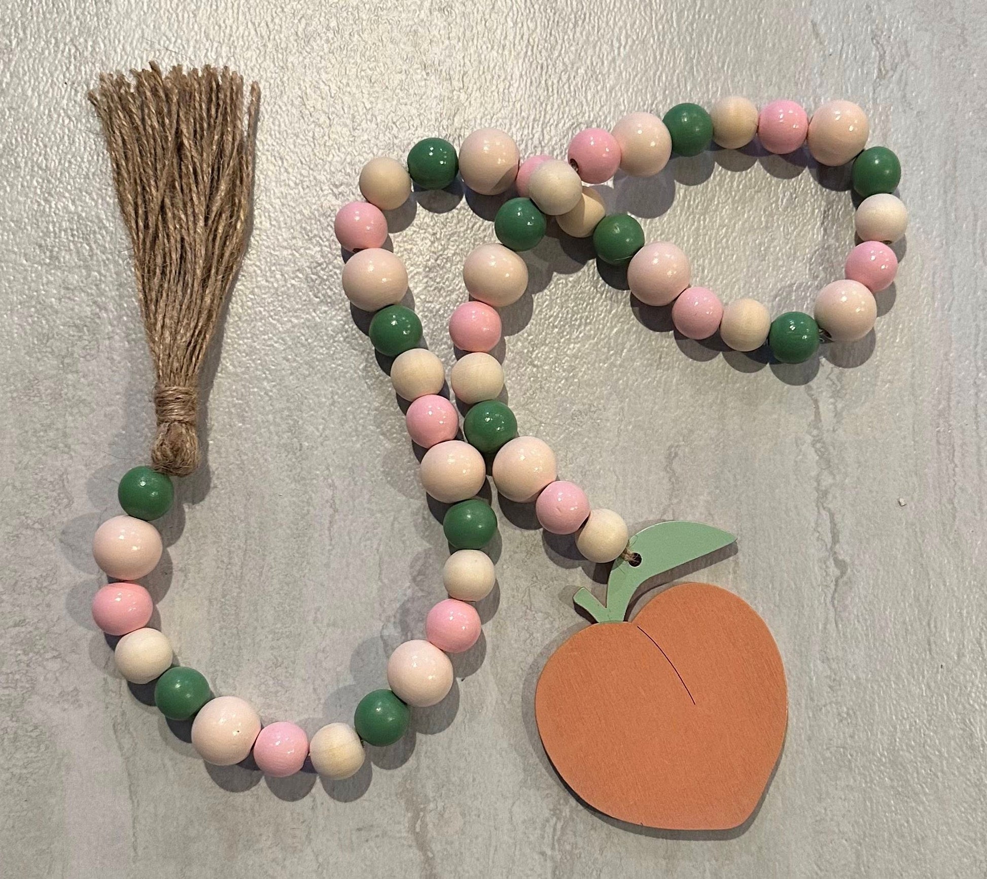 Bead garland is made with jute, painted and natural wood beads, and a peach wood ornament. Not made by Stacey.